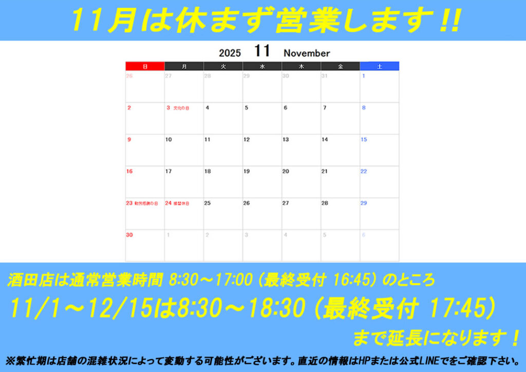 酒田店は11月1日から営業時間が8:30~18:30に変わります。