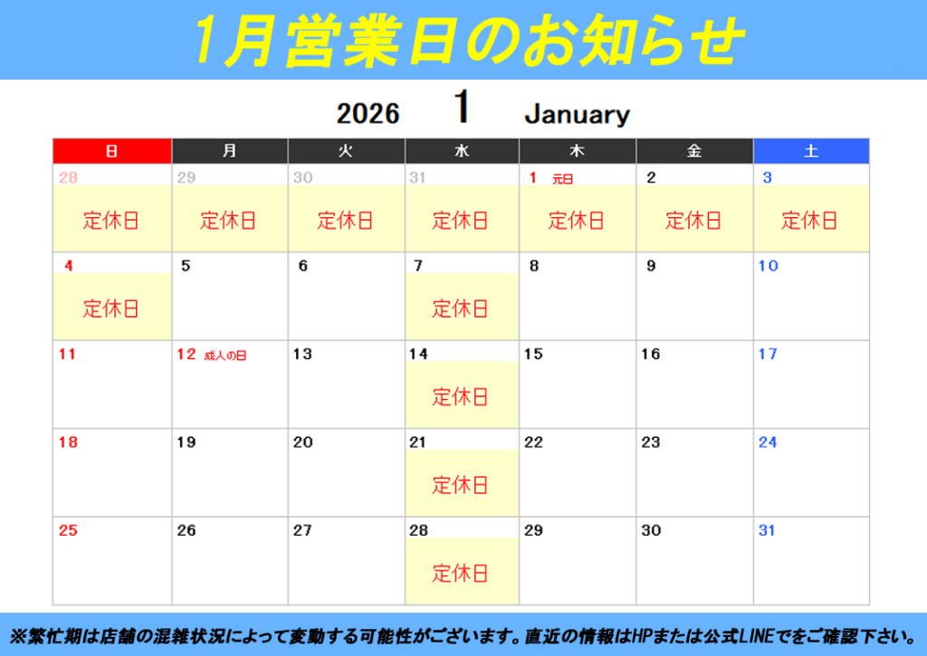 【大切なお知らせ】1月の営業日および年始休業のご案内