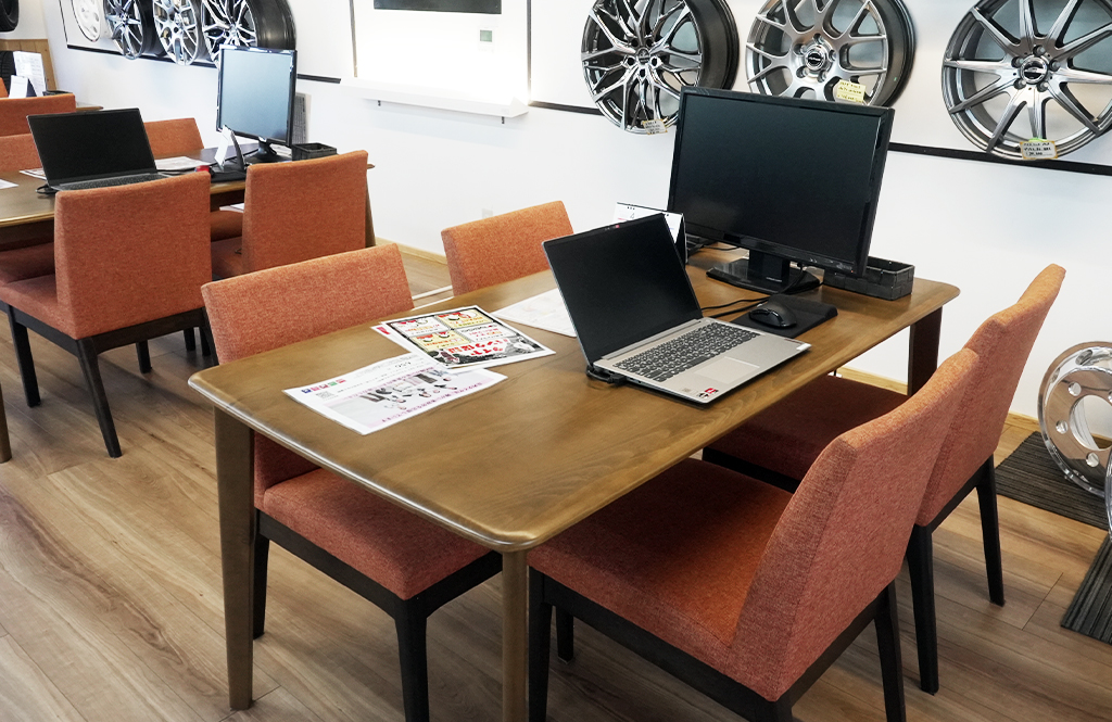 それが庄内タイヤの待合スペースです。初めてのお客様でも緊張しないように、店内は明るく清潔で、落ち着いて過ごせる設計にしています。
